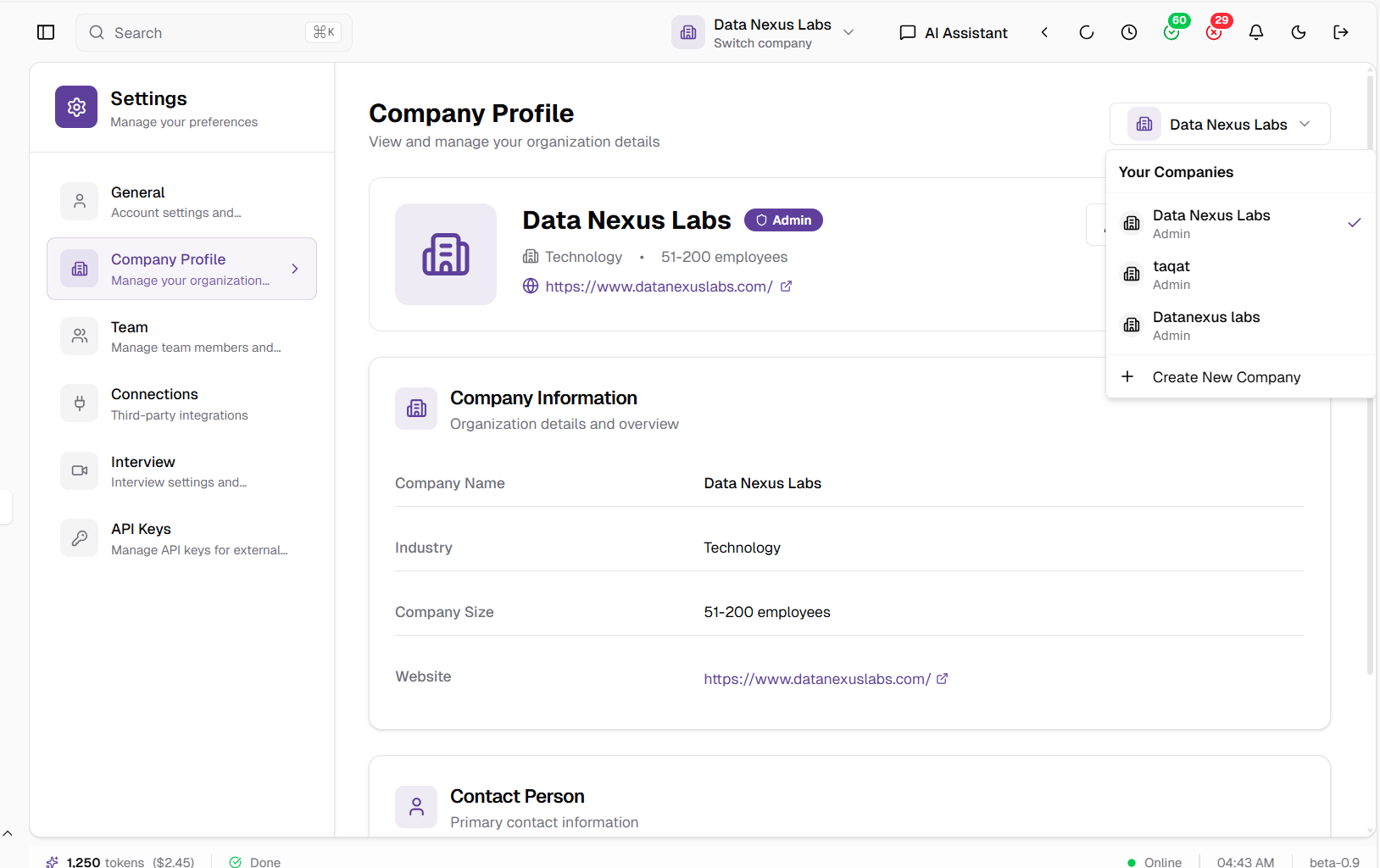 Enhanced settings navigation with Company Profile and Team sections