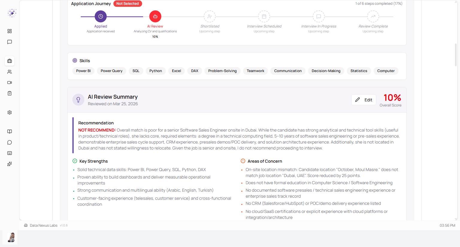 Application Journey for a rejected candidate showing Applied (completed), AI Review (red rejection point), and remaining steps greyed out