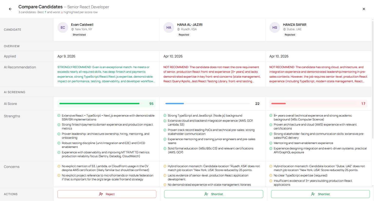 Side-by-side comparison of 3 candidates showing AI scores, recommendations, strengths, concerns, and skills
