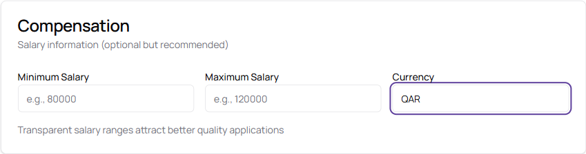 The salary currency field in the job posting form now defaults to QAR (Qatari Riyal) instead of USD. You can still manually pick a different currency if you need to.