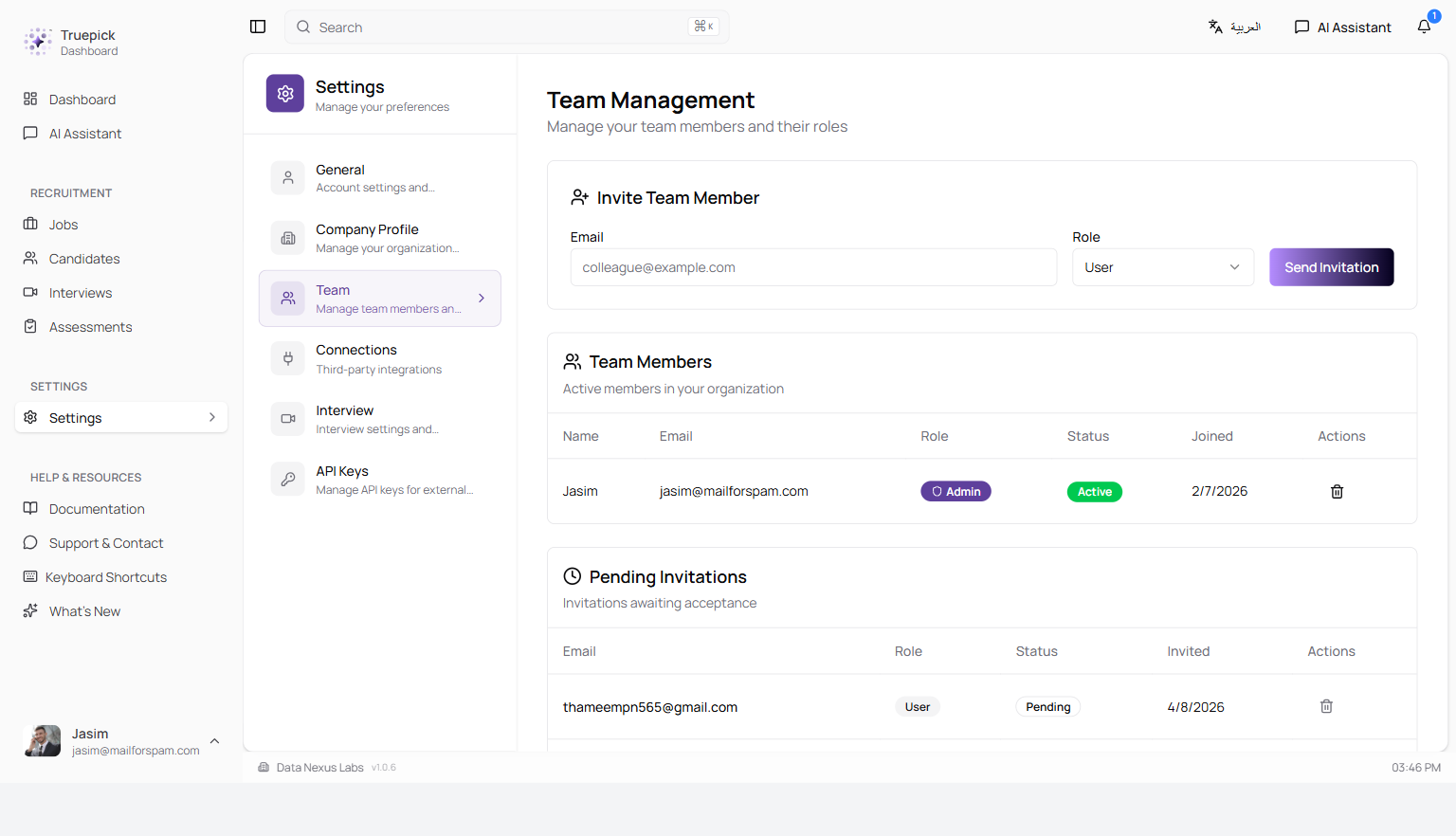 Team Management page with Invite Team Member form, Team Members table, and Pending Invitations section