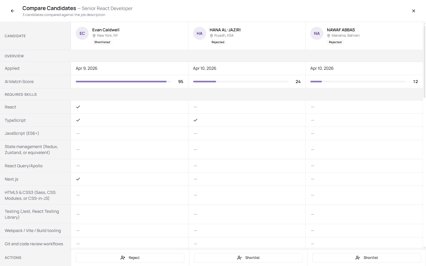 5. Shortlist or reject each candidate directly from the footer buttons