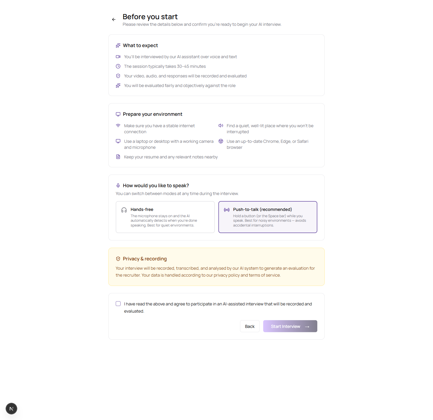 Full-screen consent step shown before the AI interview begins — with What to expect, Prepare your environment, input mode selector, and Privacy & recording sections