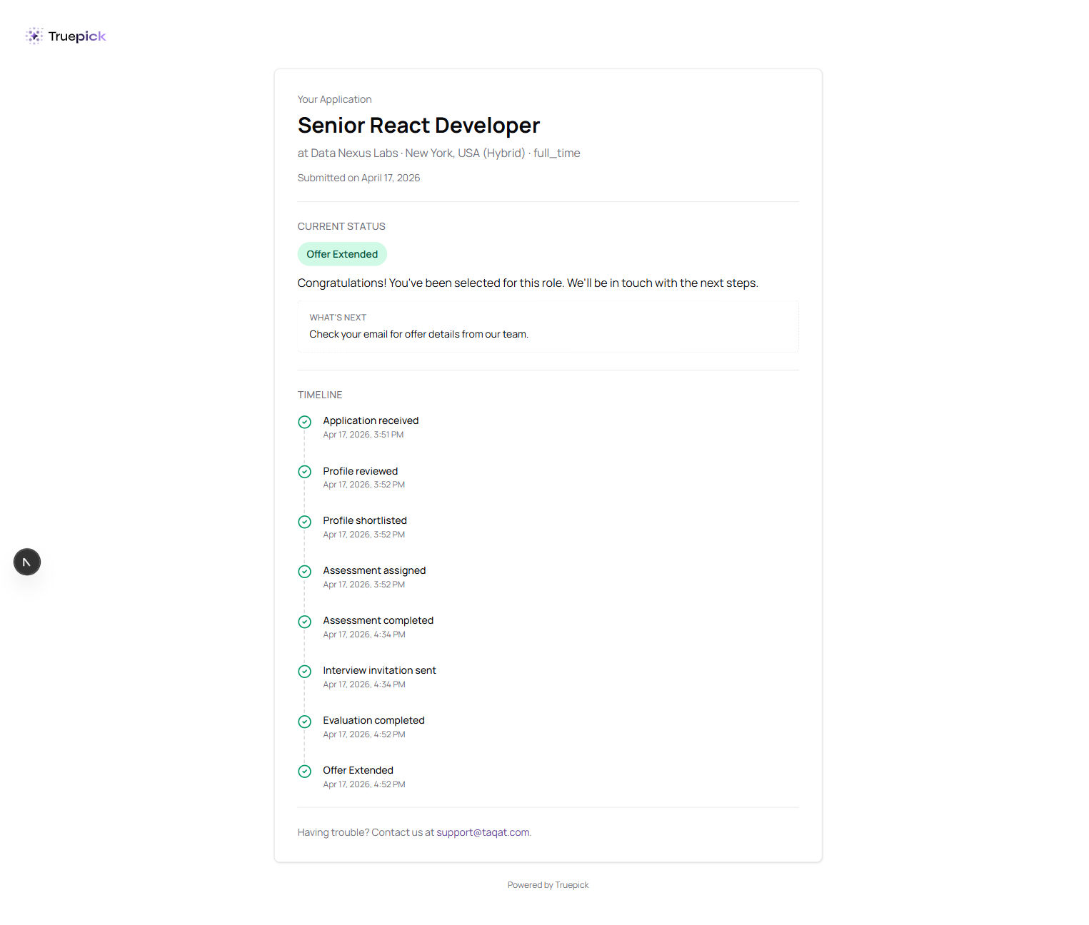 After every confirmed application, Truepick emails the candidate a secure magic tracking link. One click opens a personalised status page that stays current as the recruiter moves the candidate through the pipeline.