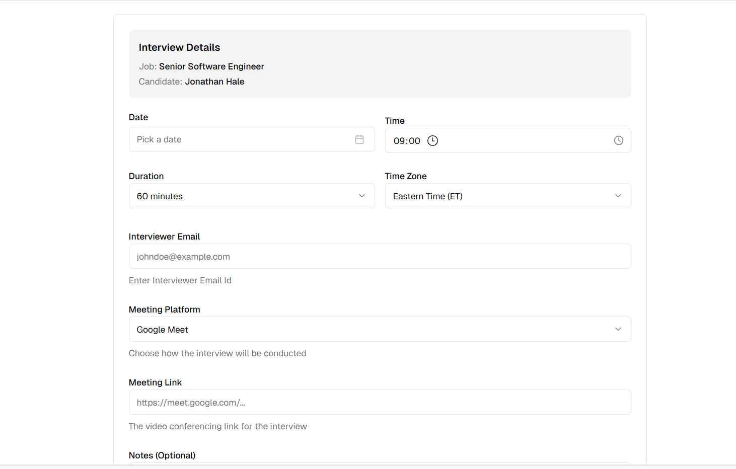 Configure all interview details in one form with flexible options for date, time, platform, and participants.